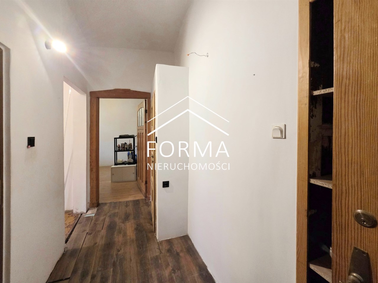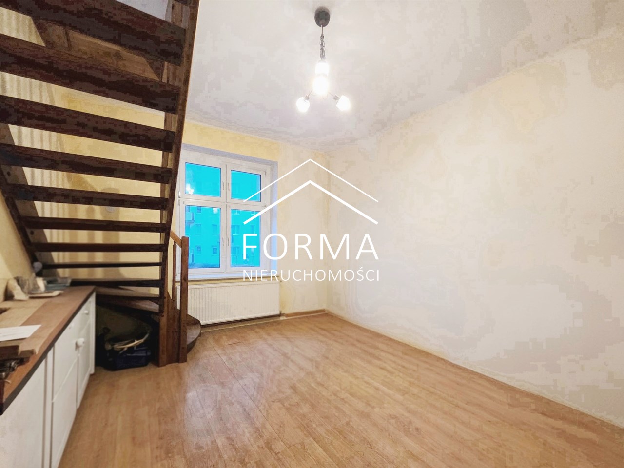 Mieszkanie jest częściowo po remoncie. 5 lat temu wymieniono wszystkie instalacje, zakupiono nowy piec gazowy, urządzono łazienkę z prysznicem oraz wymieniono okna. Gdzieniegdzie założono nowe podłogi, załatano i wygładzono ściany. W mieszkaniu częściowo zachowano oryginalną stolarkę drzwiową oraz drewnianą podłogę, która po wycyklinowaniu przepięknie przywróci blask i urok temu miejscu. Na drugą kondygnację wchodzi się pięknymi drewnianymi schodami