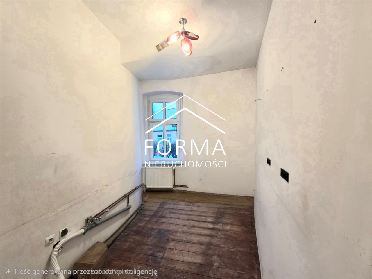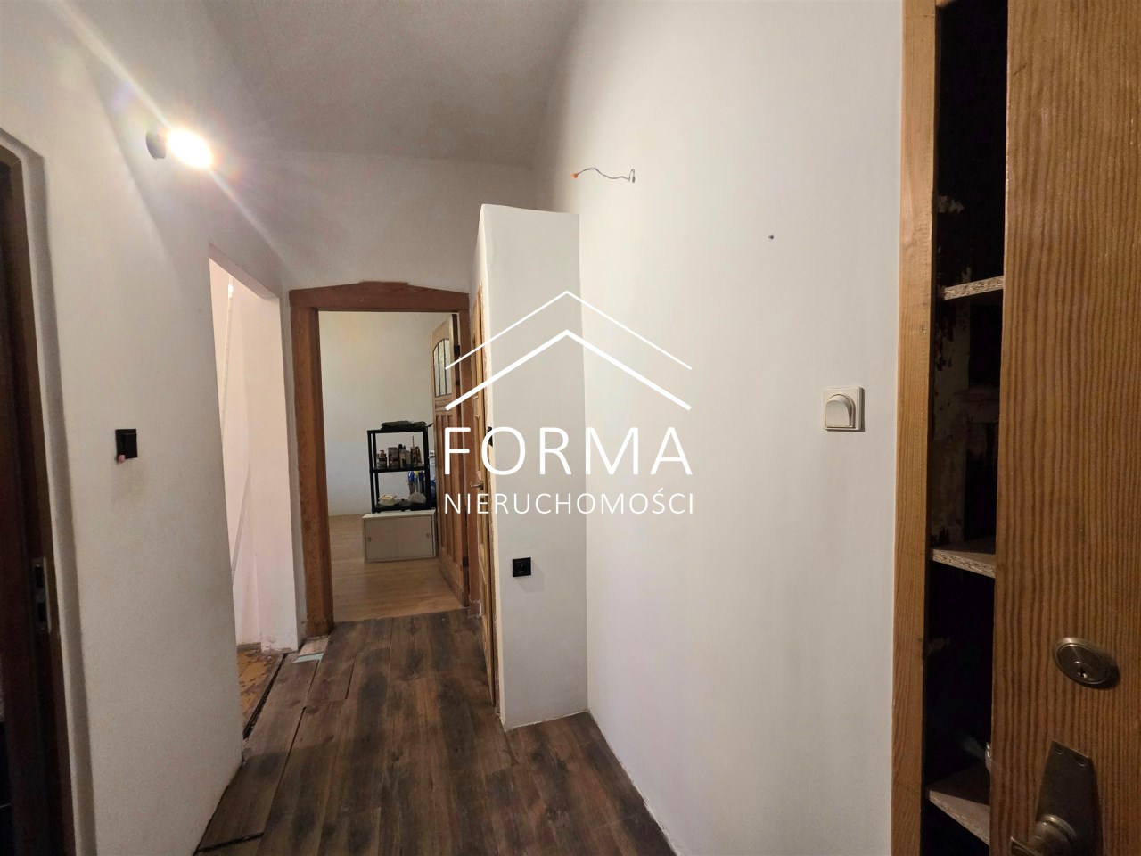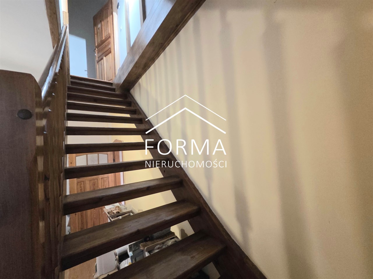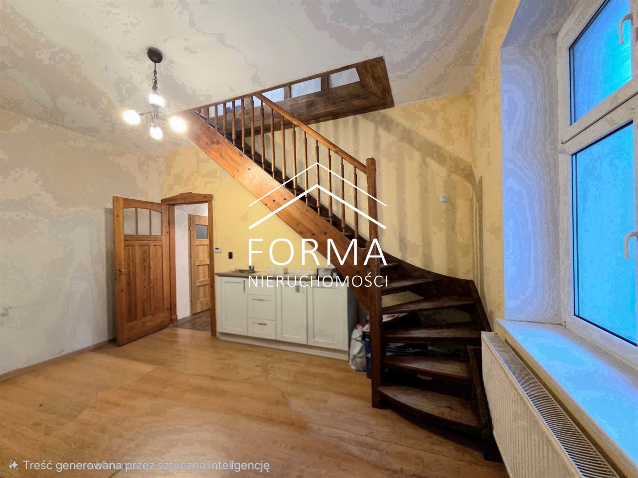 Mieszkanie jest częściowo po remoncie. 5 lat temu wymieniono wszystkie instalacje, zakupiono nowy piec gazowy, urządzono łazienkę z prysznicem oraz wymieniono okna. Gdzieniegdzie założono nowe podłogi, załatano i wygładzono ściany. W mieszkaniu częściowo zachowano oryginalną stolarkę drzwiową oraz drewnianą podłogę, która po wycyklinowaniu przepięknie przywróci blask i urok temu miejscu. Na drugą kondygnację wchodzi się pięknymi drewnianymi schodami