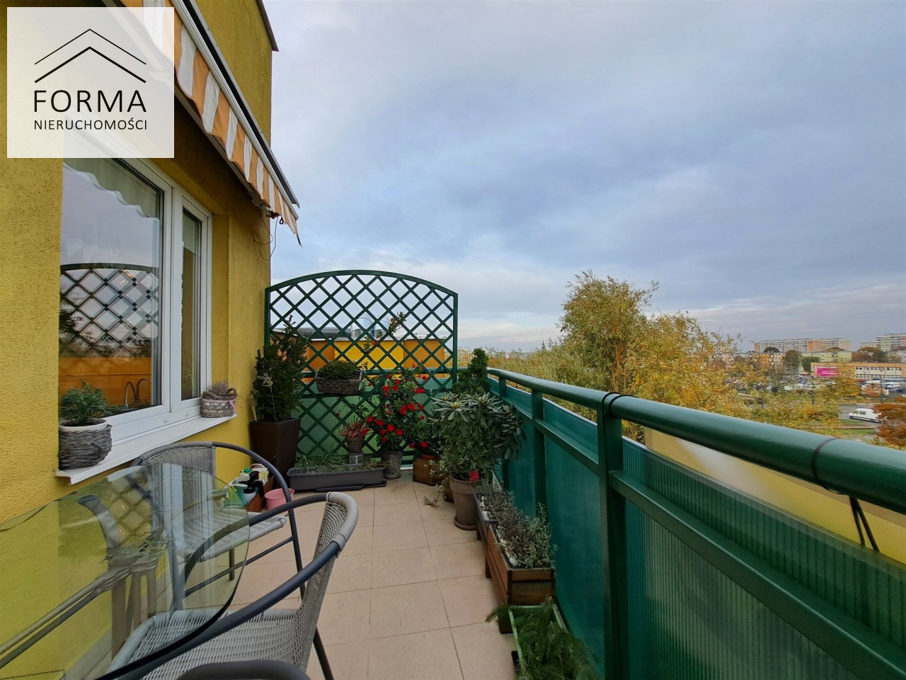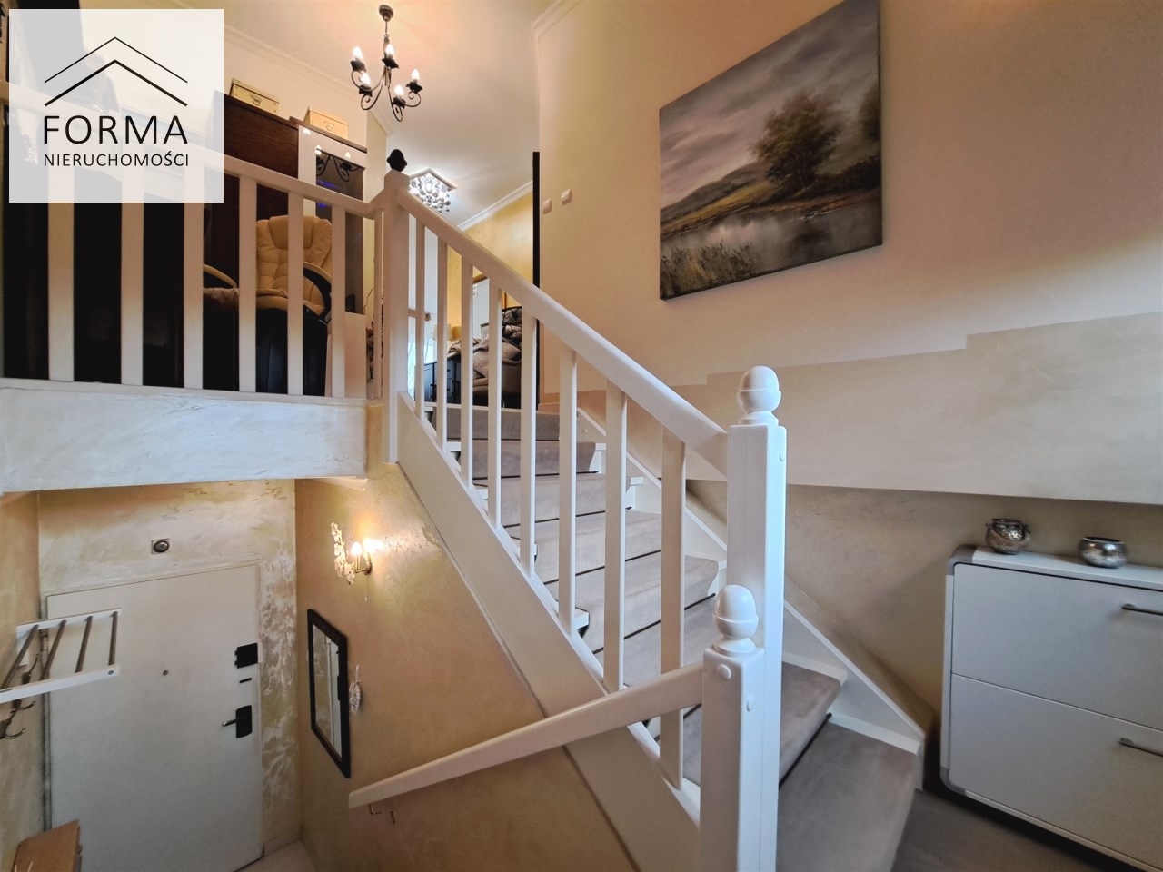 Wchodząc do mieszkania udajemy się na gorę gdzie znajduje się duży pokój dzienny z aneksem kuchennym, z którego wychodzi się na świeżo wyremontowany taras z pięknym widokiem na panoramę miasta. Taras wyposażony jest w elektryczną markizę sterowaną pilotem oraz rolety zewnętrzne.