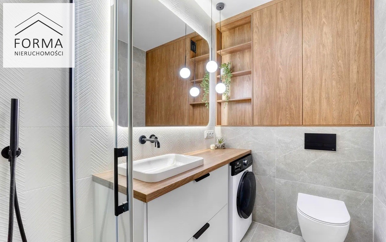 Wykończona w standardzie premium. Duże płytki o strukturze kamienia, czarna armatura, podświetlane lustro oraz zabudowy stolarskie tworzą nowoczesną i elegancką całość. Komfort użytkowania podnosi prysznic typu walk-in, ogrzewanie podłogowe oraz pralko-suszarka.