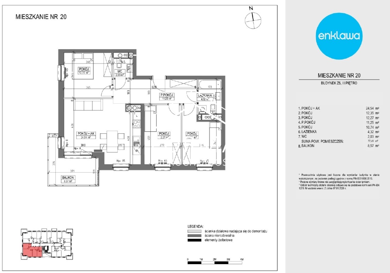 Mieszkanie o pow. 77,49 m2 składa się z :