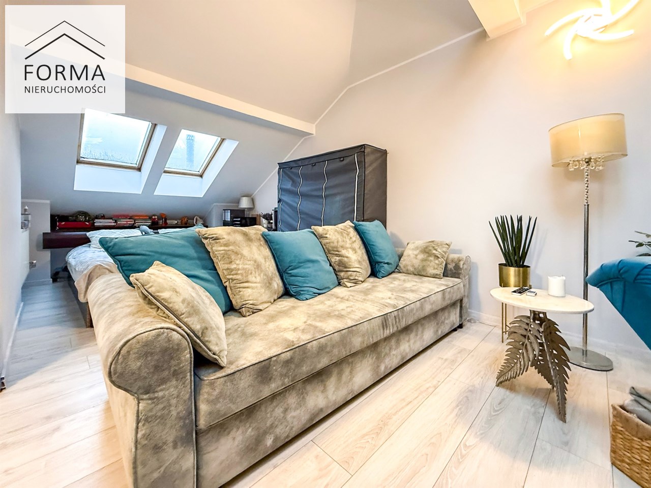 Na drugim poziomie znajduje się przytulna antresola, pełniąca funkcję sypialni połączonej z kameralnym salonikiem lub strefą relaksu — idealne miejsce do odpoczynku, pracy lub czytania.