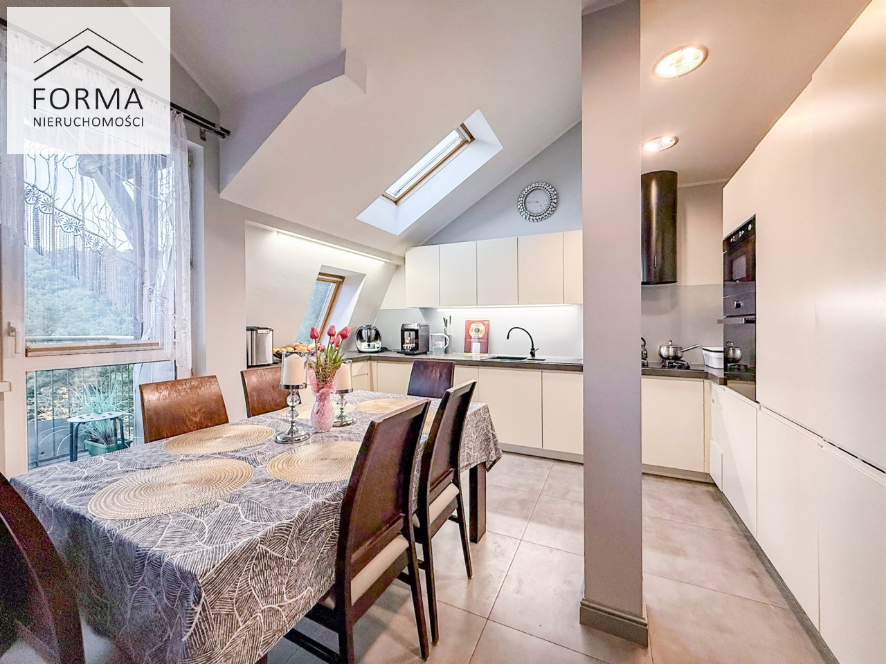 Na pierwszym poziomie znajduje się przestronny salon z aneksem kuchennym i jadalnią, tworzący serce całego wnętrza — idealne miejsce do wspólnego spędzania czasu. Z salonu prowadzi wyjście na duży, słoneczny balkon, z którego rozpościera się widok na zieleń.