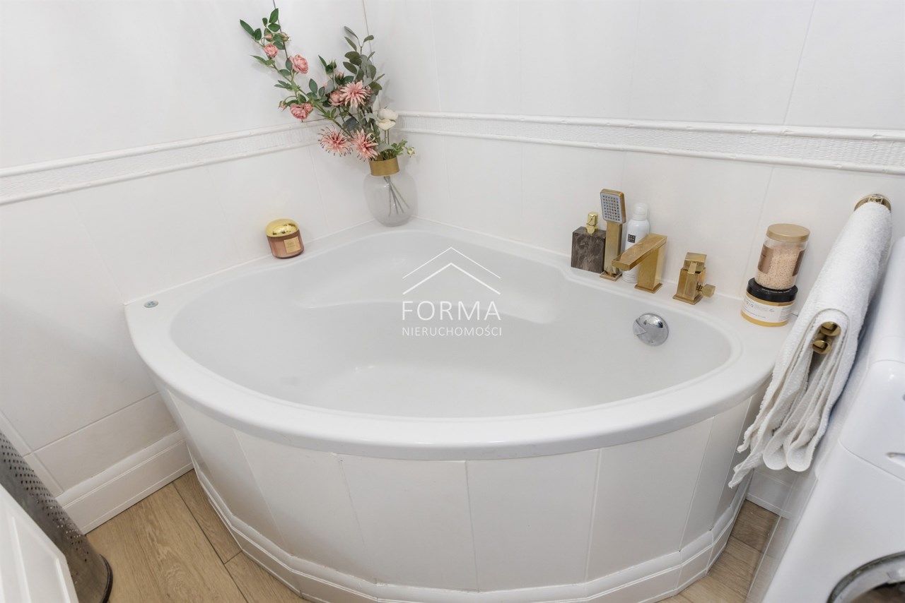 W mieszkaniu znajduje się również łazienka z narożną wanną, co pozwala stworzyć prawdziwą strefę relaksu po męczącym dniu. WC stanowi oddzielne pomieszczenie.