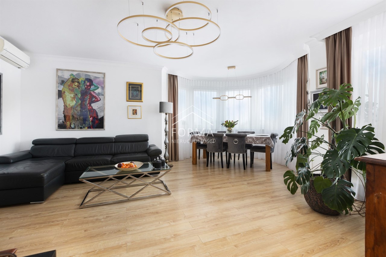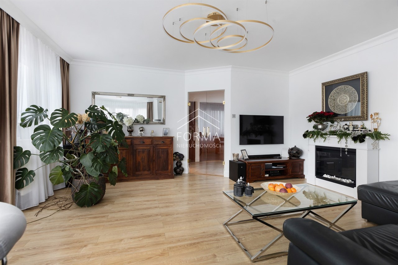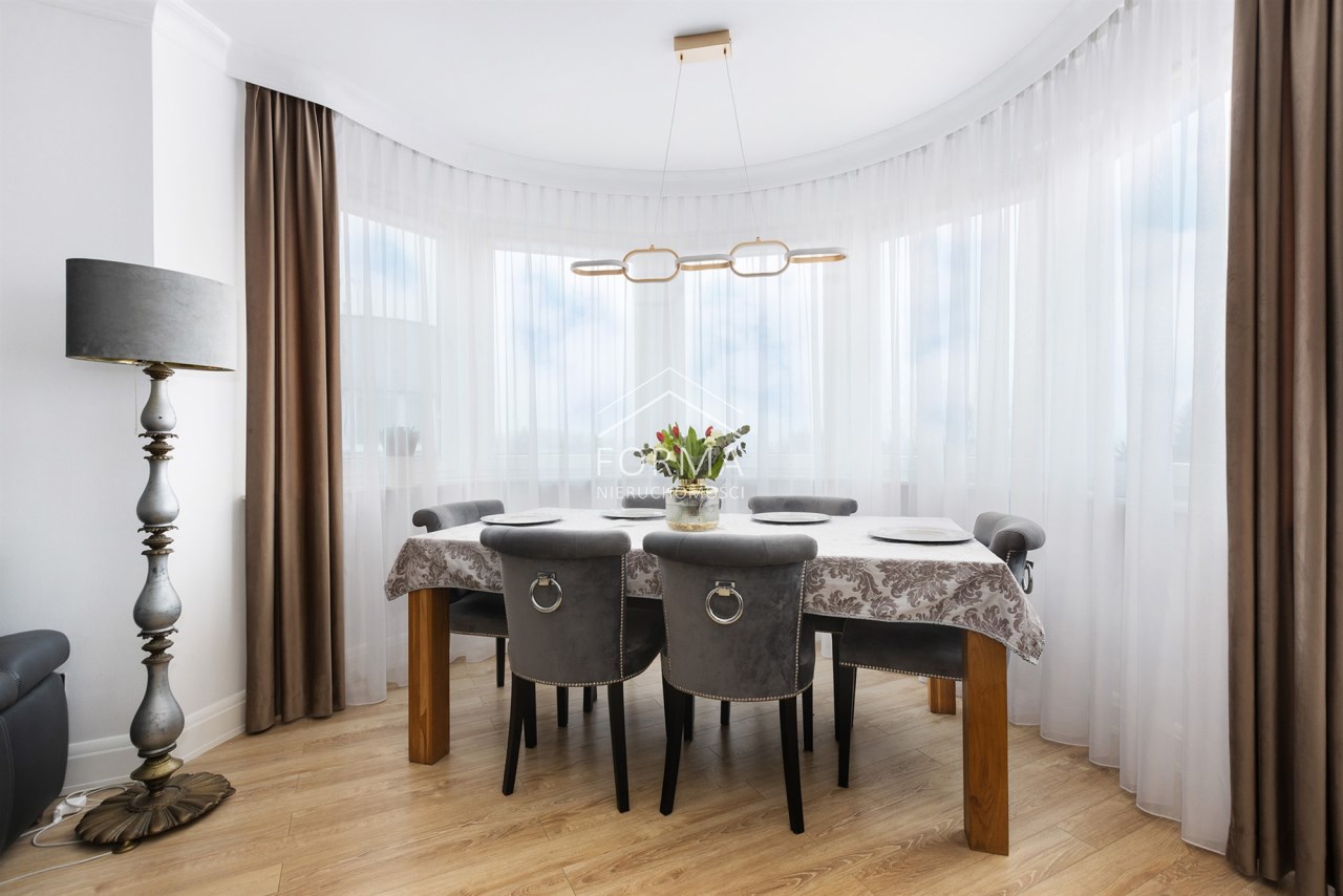 Salon z przeszklonym wykuszem to bardzo jasna, rodzinna przestrzeń. Pięknie i naturalnie dzieli się na jadalnię oraz strefę wypoczynkową z eleganckim i stylowym biokominkiem. W salonie zamontowana jest również klimatyzacja dla większego komfortu w upalne dni.